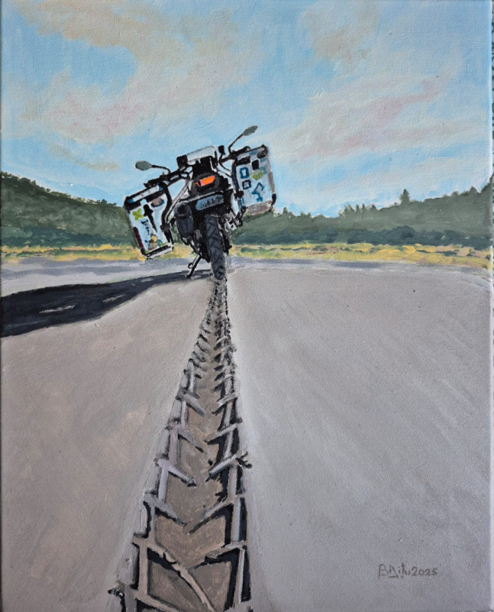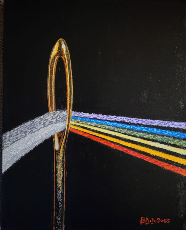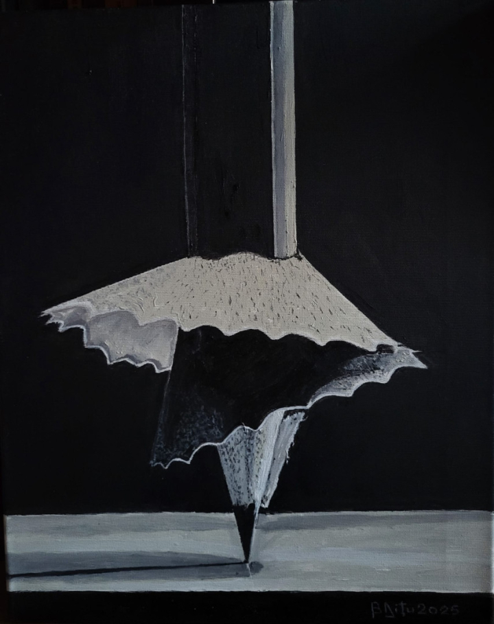 Pictura sa se mișcă la granița dintre control și fragilitate. Se simte o relație constantă între vertical și orizontal, între susținere și cădere, între ceea ce ține și ceea ce cedează. Simbolurile recurente — firul, tăișul, punctul de contact — nu funcționează ca metafore explicite, ci ca instrumente de reflecție. Ele vorbesc despre legături, despre presiune, despre momentele în care structura se schimbă ireversibil.